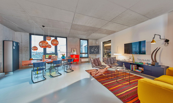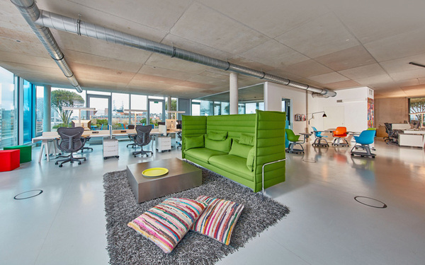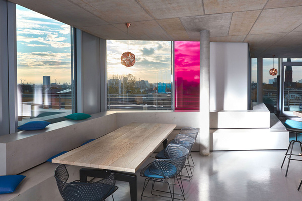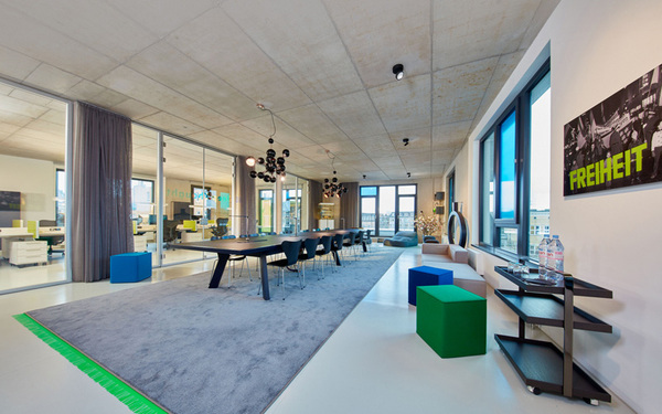 freiheit公司的文化精神通過室內(nèi)的裝飾材料和形式得以表達(dá)。組織團(tuán)隊的開放辦公區(qū)裝點(diǎn)以超大型的木制工作臺;這里配有生活廚房、大禮堂以及亮麗的創(chuàng)客空間,隨手涂寫的黑板墻、大型木制工作臺、甚至還有壁爐,公司的程序員都在這個頂層空間共同辦公、合作與休閑交流。