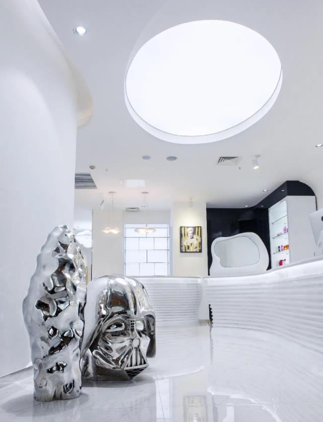 2、設(shè)計(jì)師用鏡面不銹鋼雕塑,巧妙融于時(shí)尚設(shè)計(jì),呈現(xiàn)出個(gè)性閃耀的藝術(shù)特色。金屬鏡面的材質(zhì),形成反射,使空間層次更加豐富。前臺(tái)背景墻的鯨魚立體浮雕壁飾,簡(jiǎn)約和優(yōu)雅的結(jié)合,有著高品質(zhì)且簡(jiǎn)單舒適的生活態(tài)度。辦公樓前臺(tái)做曲線設(shè)計(jì),邊緣的發(fā)光燈條,再次勾勒出前臺(tái)優(yōu)美的線條。高檔時(shí)尚的美發(fā)椅,加厚海綿坐墊,不銹鋼底盤,每一處都與空間融合。天花上不規(guī)則的燈,像是發(fā)著光的銀河。