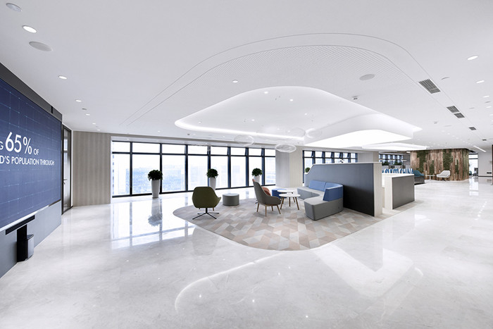 3、時(shí)尚高檔辦公樓前廳設(shè)計(jì):作為前廳,展現(xiàn)的不僅是企業(yè)的硬件形象,也是品牌的軟實(shí)力象征。地面大面積是淺灰色的天然石材,通透而潔凈;沒有傳統(tǒng)的形象墻,一片黑色石材托舉的池水位于大廳中心,背景是窗外林立的樓座和遠(yuǎn)方依稀的海灣,藍(lán)色LOGO字標(biāo)矗立在緩緩涌動(dòng)的水面之上,寧?kù)o而又蘊(yùn)含著能量。LOGO水池與分列東、西兩側(cè)的接待臺(tái)和茶水間外墻輪廓近似,三處形體平面位置相互錯(cuò)落;高低、體量不同,材質(zhì)各異,均形如卵石;外廓曲、直結(jié)合,柔順卻有張力。地面的三塊巨大“卵石”與天花對(duì)應(yīng)燈膜“浮云”相互呼應(yīng);其間的行走動(dòng)線猶如水流,自由、平滑地漲落在“卵石”之間,猶如不遠(yuǎn)處潮起潮落的海浪;交織于前廳的樞紐功能由此得到有序的組織。