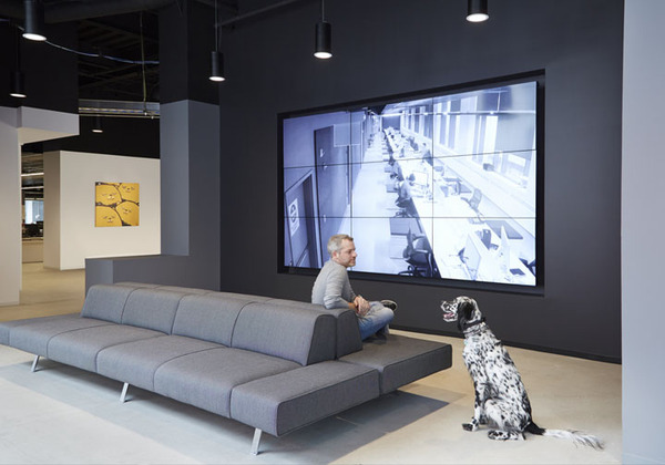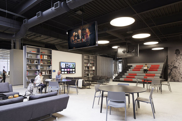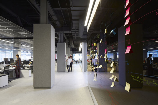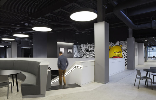 當(dāng)然作為創(chuàng)意公司,這里還規(guī)劃了一處大型集會(huì)空間,用以全體員工的聚會(huì)等活動(dòng)。各類創(chuàng)新座位區(qū),比如在大型集會(huì)區(qū)用作空間分隔的階梯看臺(tái)座椅等。室內(nèi)的裝飾表面也具有多功能性,比如墻體和結(jié)構(gòu)柱大量運(yùn)用磁性玻璃、烤漆玻璃以及可黏貼或釘圖釘?shù)牟馁|(zhì),這樣可以隨時(shí)記錄創(chuàng)意構(gòu)想。