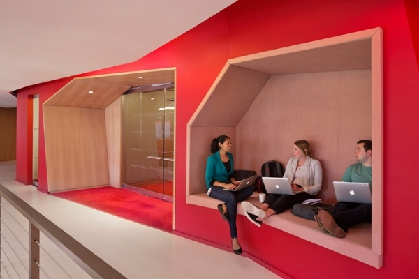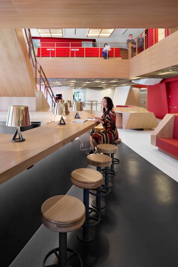 其它特殊功能區(qū)包括開闊的中庭、休閑區(qū)、咖啡吧、酒館式空間等,這樣的設(shè)計(jì)旨在促進(jìn)大家更多的聚集和互動交流,增加內(nèi)部的凝聚力,培養(yǎng)文化和知識的共享理念。