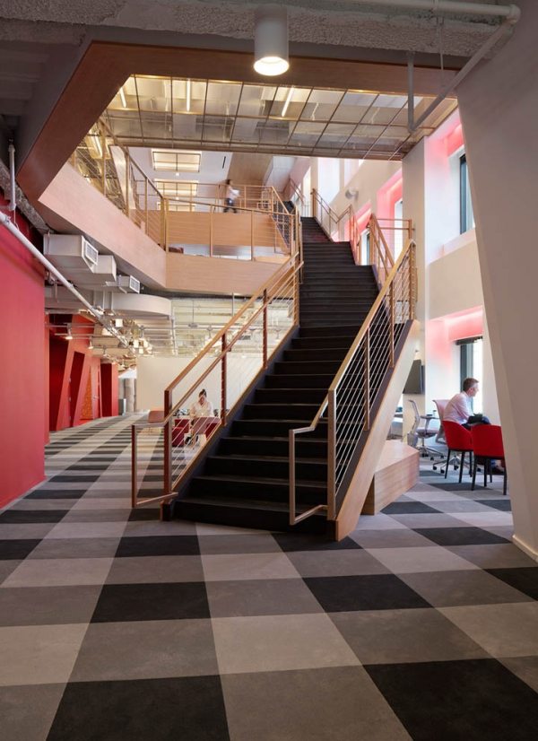 為了消除樓層間的孤立感,設(shè)計(jì)師創(chuàng)建一個(gè)活力動態(tài)的工作空間,打造了共享中庭并增加一座連接各個(gè)樓層的中庭樓梯。設(shè)計(jì)以枝繁葉茂、盎然生機(jī)的“大樹”為概念,蓬勃伸展至各個(gè)樓層,衍生出本案的幾何形空間裝飾語言,由中央核心向周邊與頂面呈樹枝狀蔓延擴(kuò)展。