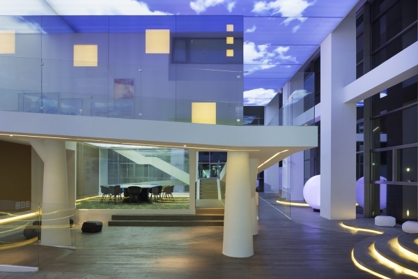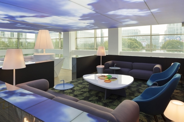 盡管這是個(gè)室內(nèi)空間,裝修設(shè)計(jì)師仍希望通過(guò)大自然的圖案為來(lái)客營(yíng)造舒適的感覺(jué)。天空?qǐng)D案的天花,樹(shù)形的支柱,植物圖形,明亮的淺色調(diào),木制材料和流線型的花園等,這些眾多的元素都將這個(gè)展廳裝點(diǎn)得與傳統(tǒng)意義上的售樓展廳與眾不同。