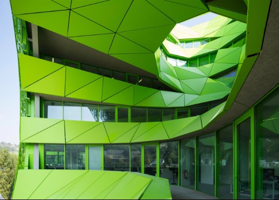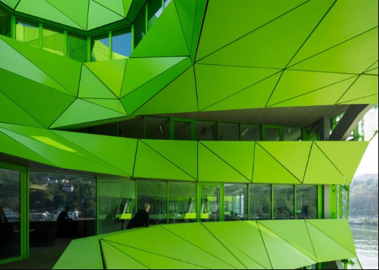 近來(lái),法國(guó)里昂海港區(qū)出現(xiàn)了一幢披著綠色外衣的大廈,它就是歐洲主流媒體之一的EuroNews新總部大樓。輕型的釉質(zhì)幕墻,覆有不規(guī)則的多孔鋁制包層。來(lái)源于河水顏色的靈感,讓綠色滲透到了辦公室的“骨血”中。