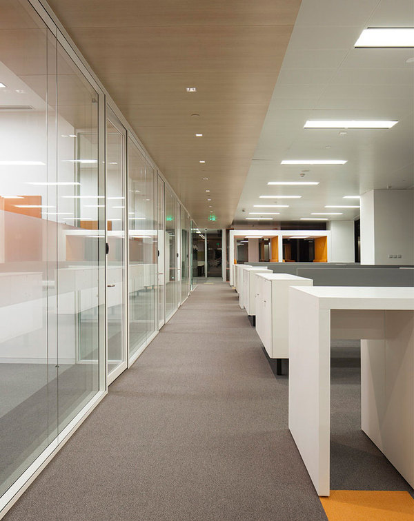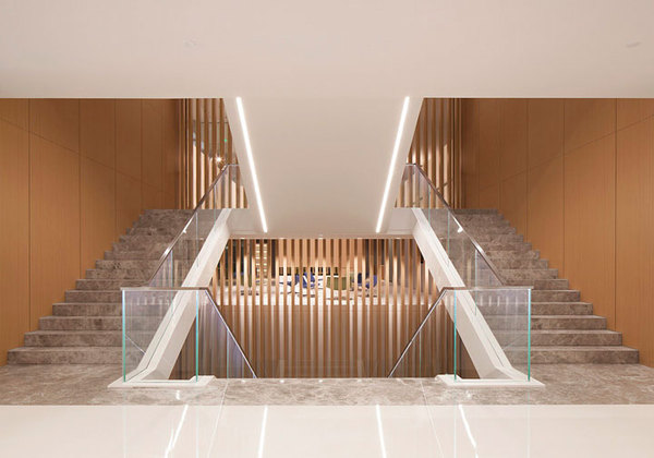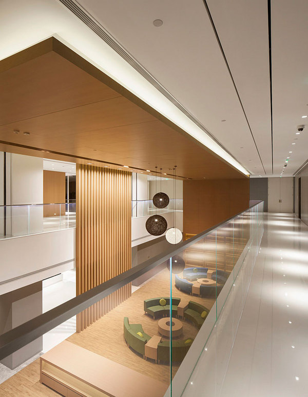 其中中間150多平面的挑空層成為貫穿上下3層辦公空間的主要樓梯通道。雙向上下滿足高流量需求。