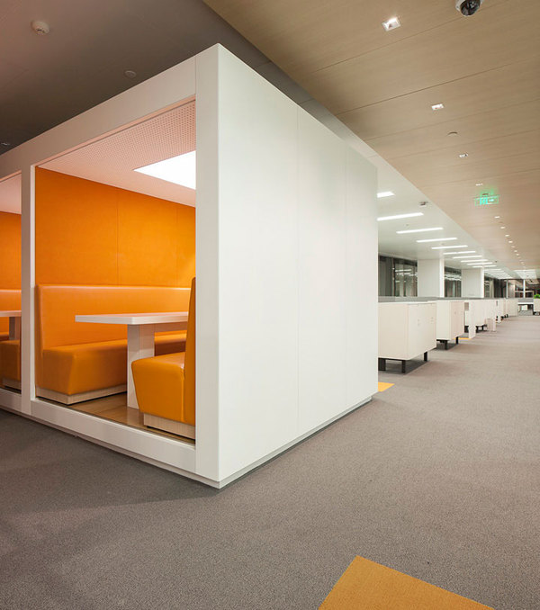 從地面延伸到天花的木色及縱向木色格柵,為員工營造溫馨舒適的緩沖空間并可作為開放討論區(qū)使用。