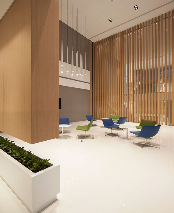 接待區(qū)的造型整體簡潔**視覺沖擊,正面縱向的木色格柵代表造紙業(yè)的原材料木材。