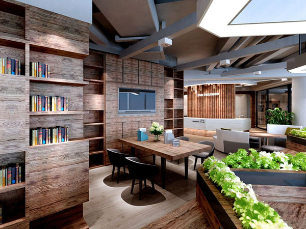 前臺過渡區(qū)域的設計,設計師以無邊界為主題對空間進行設計,意在打造一個休閑、溫馨的辦公交流空間。