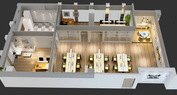 俯視圖:通過以上的俯視圖大家對于空間會有一個直觀的認(rèn)識,企業(yè)品牌設(shè)計在外部墻面,經(jīng)過進(jìn)門區(qū)域進(jìn)入辦公室,首先經(jīng)過的就是形象墻,到達(dá)打印茶水區(qū)域,通過動線拐彎經(jīng)過開放式辦公區(qū)域與會議室、副經(jīng)理辦公室,**到達(dá)總經(jīng)理辦公室與拍攝區(qū)域。