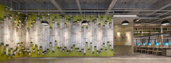 洽談區(qū)域的設計,設計師特意設計成綠意空間,設計師認為人們往往遠離大自然,因此需要在空間中多增添一些綠色,雖然面積有限,但能給交談提供一個很好的洽談環(huán)境。