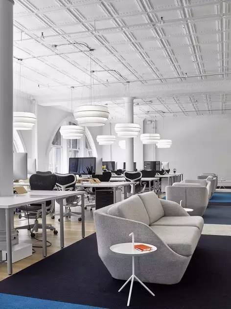 整個(gè)辦公區(qū)成L形布局,一條由藍(lán)灰相間的瓷磚鋪成的通道將員工迎入辦公區(qū),辦公區(qū)擁有*多的自然光照,同時(shí)來(lái)自于Rich Brilliant Willing公司巨大的燈具為整個(gè)辦公空間在晚間提供舒適的照明環(huán)境。會(huì)議室結(jié)合歐式與美式兩種風(fēng)格,簡(jiǎn)潔時(shí)尚的特點(diǎn),為空間增加了透明感。灰色Moroso沙發(fā)和白色Anglepoise經(jīng)典燈具的休息區(qū),則為員工提供了舒適的飯后咖啡與休憩空間。