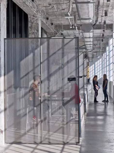 由TPG Architecture設(shè)計(jì)的位于溫斯頓塞勒姆市Wake Forest創(chuàng)意新區(qū)內(nèi)的3500平方米的MullenLowe辦公空間。設(shè)計(jì)者保留了這間上個(gè)世紀(jì)30年代的香煙工廠內(nèi)深色金屬框架的窗格與裸露的混凝土,以此為改造設(shè)計(jì)奠定了粗獷的基調(diào)。同時(shí)在這間4.2米凈高的室內(nèi)嵌入了數(shù)個(gè)木質(zhì)方形盒子,形成層層鑲嵌的空間結(jié)構(gòu)。