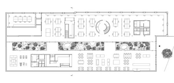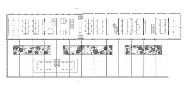 綠植陽(yáng)光房的一側(cè)為提供休息座椅的雙層空間,中心區(qū)域的白色體塊包含了一個(gè)衛(wèi)生間與大理石臺(tái)面的咖啡間。陽(yáng)光房的另一側(cè)為兩層辦公空間,通過旋轉(zhuǎn)樓梯連接。同時(shí),建筑立面上增加了一排大窗戶,以擴(kuò)大從街道到辦公室內(nèi)的視野。
