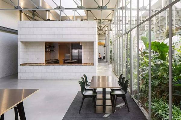 由荷蘭Space Encounters工作室為設(shè)計(jì)和制造人體工程學(xué)童車的Joolz公司,剛剛完成了位于阿姆斯特丹北部的一個(gè)1600㎡的辦公樓改造。這座玻璃屋原來(lái)作為舊倉(cāng)庫(kù),設(shè)計(jì)者首先去除底層室內(nèi)的所有墻體,利用高聳的種滿植物的玻璃屋將整個(gè)空間分成兩個(gè)長(zhǎng)廊似的辦公室,玻璃屋一直連到屋頂,與天窗結(jié)合在一起。