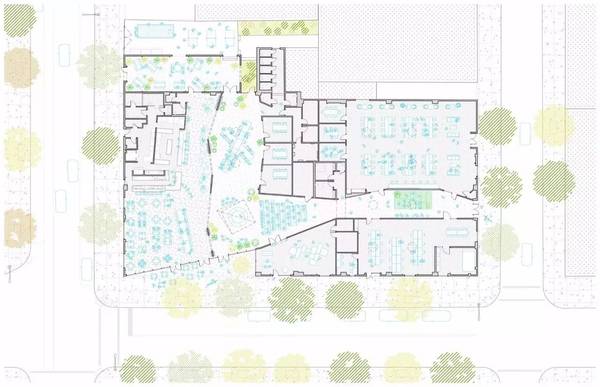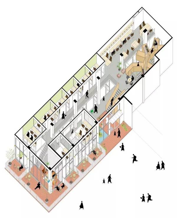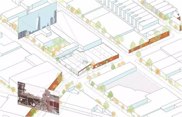 這樣的設(shè)計(jì)手法,給予室內(nèi)空間相互關(guān)聯(lián)。同時(shí),設(shè)計(jì)者還對(duì)建筑入口進(jìn)行了從視覺化的處理,移除面向西南角的三角形的區(qū)域,改為透明的立面,將被涂鴉的磚墻重新組裝,以制造出不同的涂鴉樣式,以此表現(xiàn)建筑以及社區(qū)間層層疊加以及穿插的歷史。