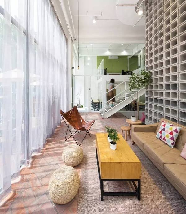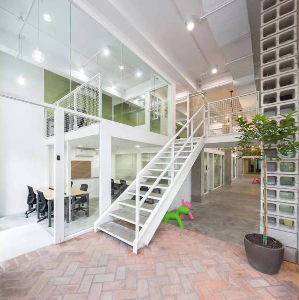 由一十一建筑改造設(shè)計(jì)的位于深圳的一棟聯(lián)合辦公空間,建筑由一棟工業(yè)建筑的首層一部分改造而來(lái)。由于室內(nèi)具有很高的天花,在確保自然光線能達(dá)到場(chǎng)地較深區(qū)域的前提下,設(shè)計(jì)者在局部區(qū)域設(shè)計(jì)了夾層。利用天花的高度,創(chuàng)造出更多的變化形式。同時(shí),利用一系列戶外建筑材料使用在室內(nèi)空間,作為重要公共區(qū)域的特色景觀墻,紅磚在室內(nèi)于室外的連續(xù)鋪設(shè),以模糊室內(nèi)外邊界和處理高差。
