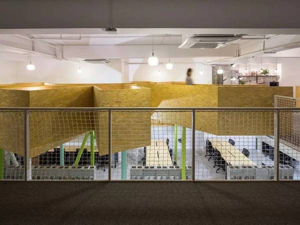 建筑**特點(diǎn)的是由鐵架搭建外包歐松板,并由一些鐵的支柱承托抬升到夾層的高度的“云座”休閑吧,其擺脫室內(nèi)透視主導(dǎo)的造型,以及隱藏結(jié)構(gòu)之后整體的漂浮感,為室內(nèi)創(chuàng)造了一個(gè)脫離工作取得休閑環(huán)境。