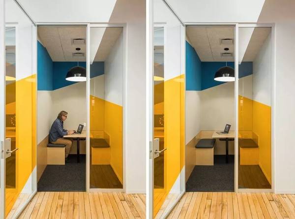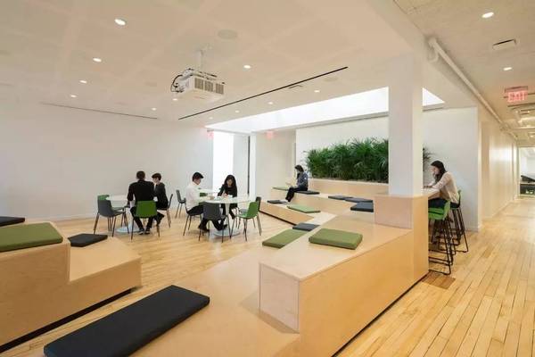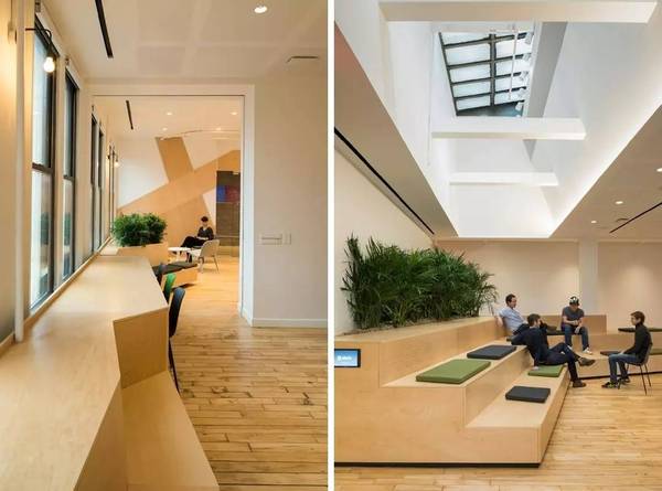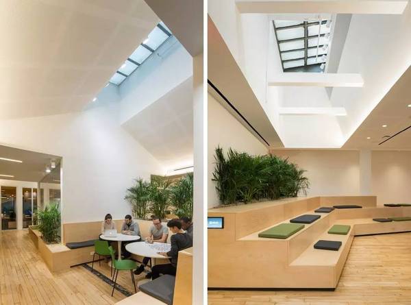 Sn?hetta對(duì)Slack新紐約空間設(shè)計(jì)的靈感來(lái)源于**特色的城市小院。從Paley Park的室內(nèi)景觀中吸取靈感,竹植物提供自然的隱私屏幕,并為綠化帶來(lái)空間。現(xiàn)有四個(gè)天窗與放大,八字天花板大大增加了室內(nèi)以及內(nèi)部小庭院的自然光線。