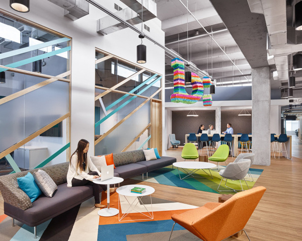 Bazaarvoice奧斯汀總部共設(shè)有14個(gè)開放共享的協(xié)作工作區(qū),每一處都充滿視覺張力令人流連忘返,獨(dú)特的紋理地毯、花色壁紙和創(chuàng)意燈具讓每一處都是滿滿的精彩。從平面規(guī)劃、空間設(shè)計(jì)、到家具配置、照明設(shè)計(jì)、以及室內(nèi)所有的圖形和標(biāo)識(shí)設(shè)計(jì),全部由lauckgroup設(shè)計(jì)團(tuán)隊(duì)一手打造,從而呈現(xiàn)出**的空間效果。