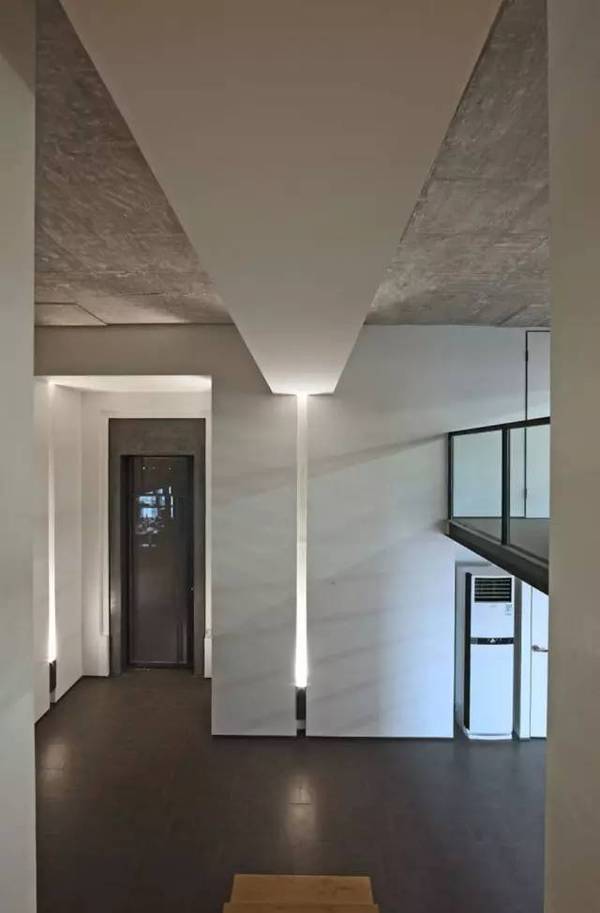 樓梯在中間往兩側(cè)分開,在高高的白墻中間,如同一道通往別處的裝置,吸引觀者登梯探訪。通過白墻和天花間露出的微光,可以看到白墻并未真正與墻接合,且邊緣用鋼條鑲嵌,展露出更鮮明挺拔的體塊形狀。為了提升空間的立體感,門廳沒有設(shè)置照明設(shè)備,唯有從遠(yuǎn)處墻壁的燈柱迎來的淡淡白光,令觀者一進(jìn)門即在這份寧靜中得到放松。