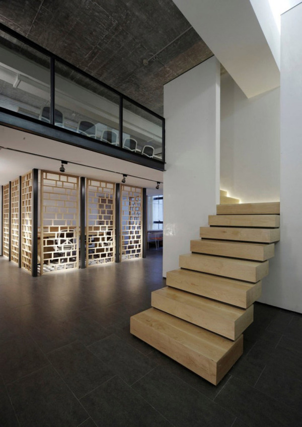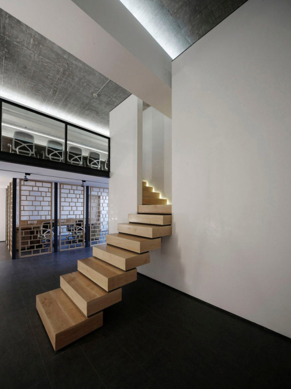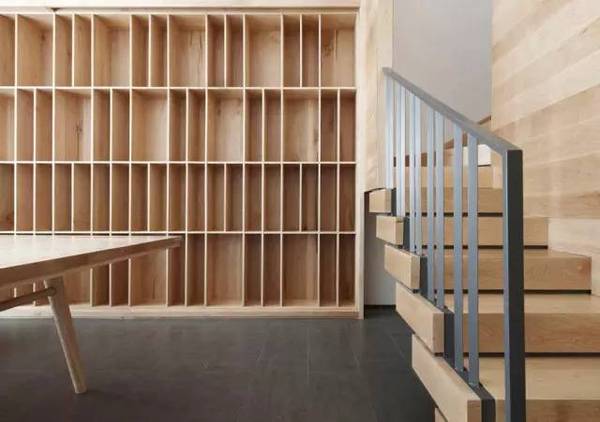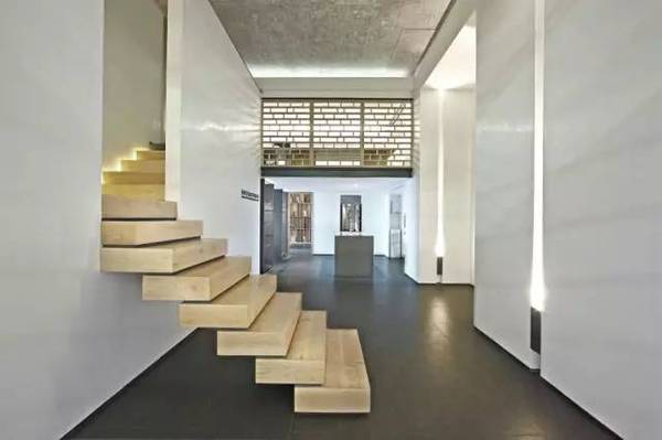 挑高的入口門廳中,地面運(yùn)用了灰色仿古磚,原本白色的天花板表皮被鏟掉,露出原有的混凝土表情,打砂的方式使天花板既達(dá)到防塵的效果,又擁有特殊的細(xì)膩肌理。門廳中央為兩道白墻,白墻中間的細(xì)縫夾著一道窄窄的無扶手樓梯。這個看似冒險的設(shè)計(jì)實(shí)際上解決了屋頂建筑橫梁帶來的對閣樓人員流通的阻礙問題。