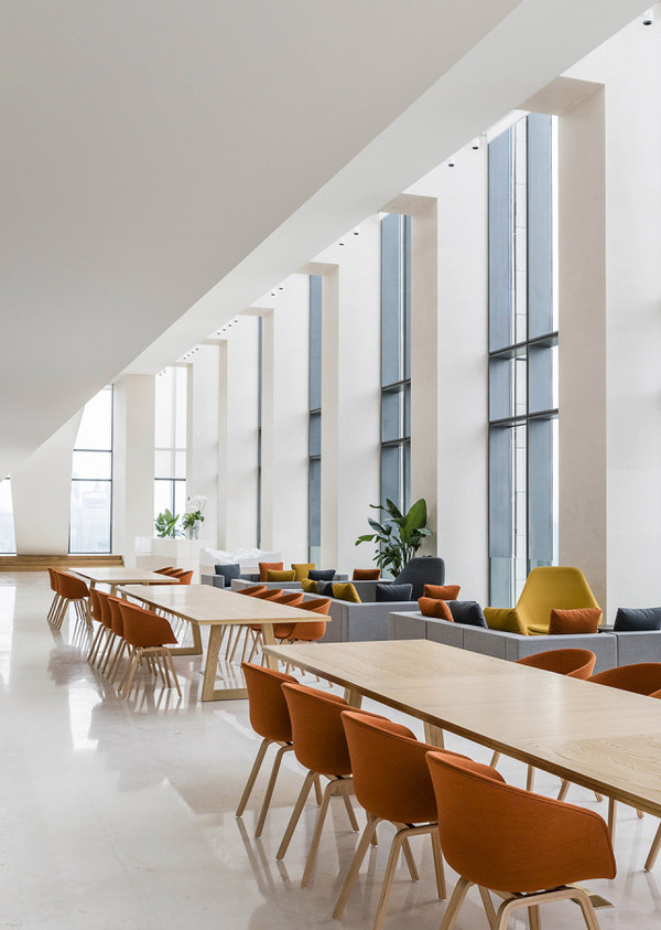 每天,人們都會(huì)在辦公室中呆很久,所以設(shè)計(jì)師希望創(chuàng)造一個(gè)舒適而又智慧的場(chǎng)所。設(shè)計(jì)師為天花上的燈加上了一層反射膜,這樣整個(gè)天花都能發(fā)出柔和的漫反射光。這是一個(gè)充滿創(chuàng)新而又微妙的設(shè)計(jì),連接室內(nèi)外。諸如用戶自己設(shè)計(jì)的地毯和藝術(shù)品這類的細(xì)節(jié),也顯示出外灘SOHO的空間精神,同時(shí)也給這個(gè)開(kāi)放大空間以豪華而又親密之感。