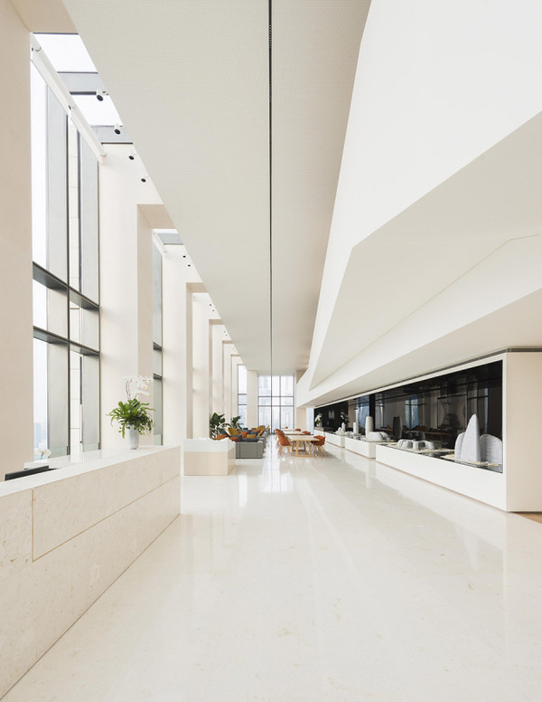 室內(nèi)和室外同時(shí)使用了簡(jiǎn)化的米黃色的石材,作為對(duì)于外灘老上海建筑的一種追溯,還使用仿佛能把人帶入未來(lái)的簡(jiǎn)潔而堅(jiān)硬的白色墻面。此外還有許多的小細(xì)節(jié):電梯廳附近45度的傾角;奶油色的石材使得空間看上去更加開(kāi)闊;明亮的光照,在上海的古老和現(xiàn)代之間尋找到平衡。