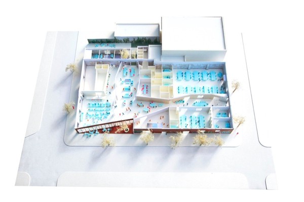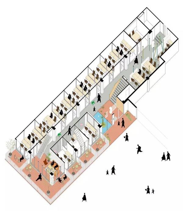 這樣的設(shè)計手法,給予室內(nèi)空間相互關(guān)聯(lián)。同時,設(shè)計者還對建筑入口進行了從視覺化的處理,移除面向西南角的三角形的區(qū)域,改為透明的立面,將被涂鴉的磚墻重新組裝,以制造出不同的涂鴉樣式,以此表現(xiàn)建筑以及社區(qū)間層層疊加以及穿插的歷史。