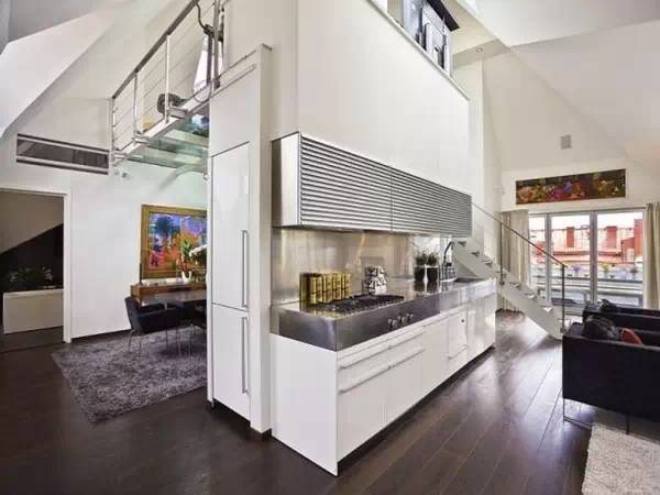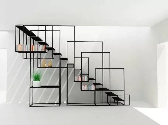 木質或鐵藝懸浮樓梯在這個沉悶的空間成為了一個活潑的設計元素。