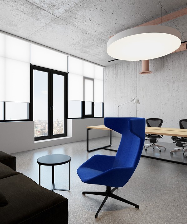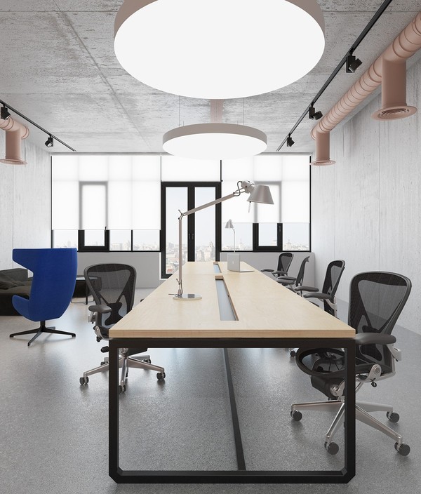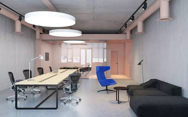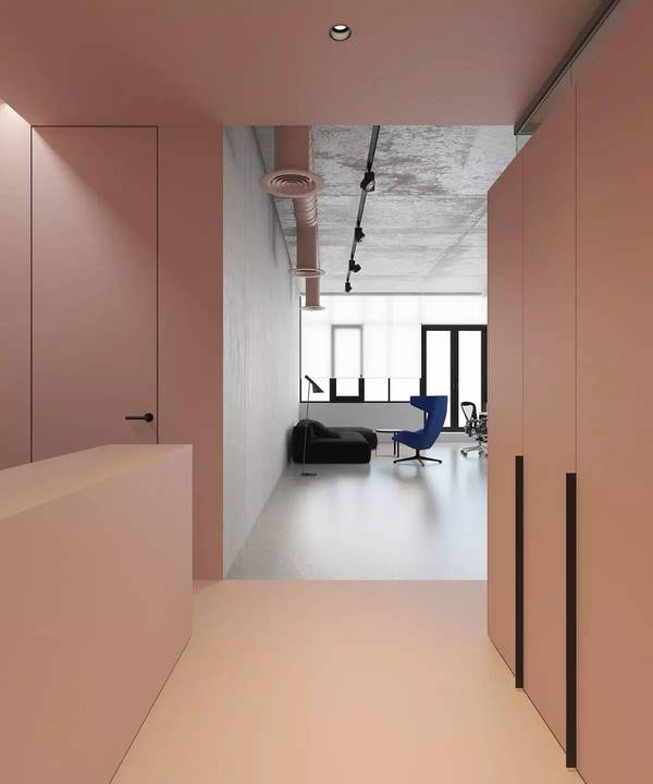 外露的鋼管也被粉刷成粉色,整個空間采用混凝土鋪陳,從地面延伸至墻面,天花,統(tǒng)一的材質讓空間變得簡潔,干凈,中央擺放著一張長條形的巨型辦公桌,通過淡色木質面板以及黑色鐵件塑造出輕盈靈巧的視覺感受。休息區(qū)用黑色轉角沙發(fā)搭配鮮艷的寶藍色單人椅,帶來鮮明的對比。