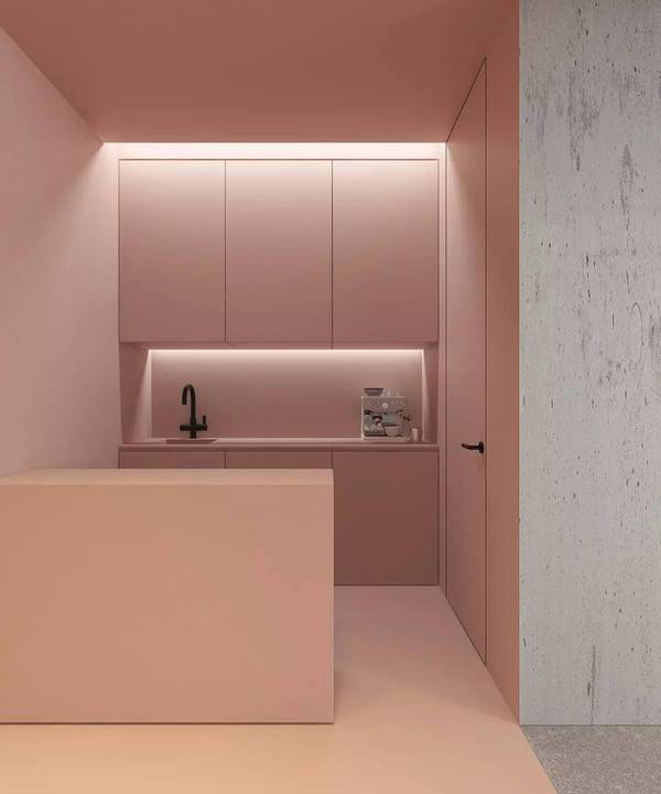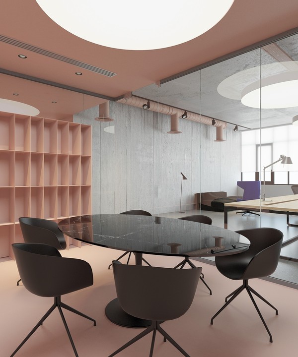 用玻璃隔斷劃分出會議室,肉粉色的空間搭配質感的黑色桌椅,柔美與硬朗相互沖突,形成強烈的視覺感受。