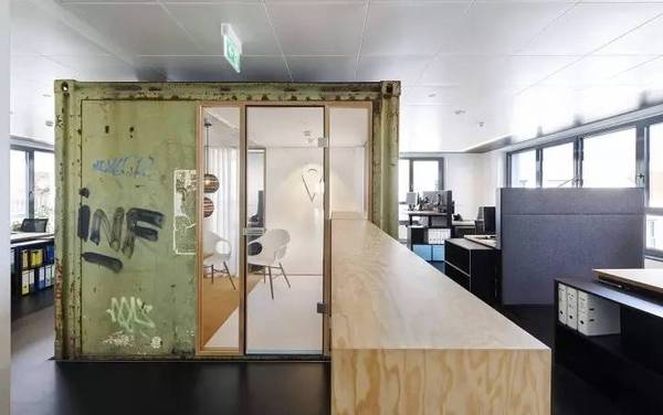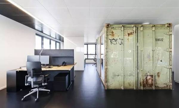 在整個(gè)辦公室空間中,與空間“格格不入”的是一個(gè)集裝箱,這個(gè)有著多次海上經(jīng)歷的集裝箱成為辦公室的亮點(diǎn),在辦公室施工階段,集裝箱被吊進(jìn)室內(nèi),成為內(nèi)部的一間會(huì)議室。