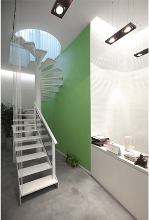 裝修的色彩并不是多種顏色搭配呈繽紛靚麗的景象,而是簡單的青綠色為主題,經(jīng)典黑白色輔助映襯。綠色的裝修裝飾給人青春活力的感覺,用在這里再合適不過了。其次是樓梯的造型設(shè)計(jì),圓形旋轉(zhuǎn)樓梯,造型上的別致同樣也帶來了異樣的體驗(yàn)。