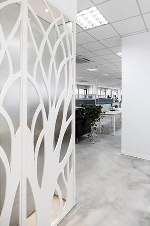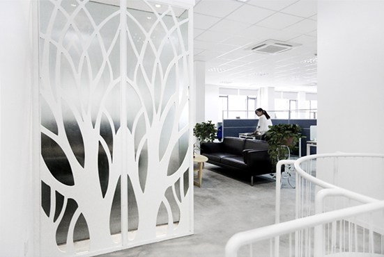 辦公室裝修的屏風(fēng)設(shè)計(jì)不僅僅是處于玄關(guān)的作用而設(shè)置,也有著很大的裝飾作用。鏤空的樹形結(jié)構(gòu)造型設(shè)計(jì),一層模糊的鋼化玻璃,隔絕視線的同時(shí),也營造了一個(gè)朦朧而富有趣味性的室內(nèi)空間。