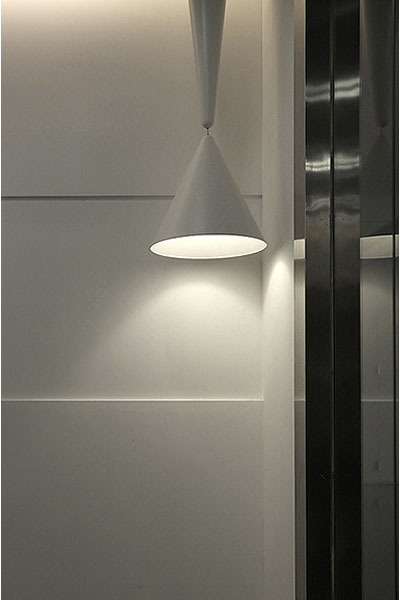 墻面的錯格設(shè)計(jì)非常有層次感,簡單的設(shè)計(jì)并非沒有看點(diǎn),設(shè)計(jì)師改變環(huán)境外觀的方法手段數(shù)不勝數(shù);但是能通過極為簡單的手法讓環(huán)境從簡樸中透漏出深厚的內(nèi)涵,這就是一件比較考驗(yàn)技巧的事情。而圖中的圓錐造型吊燈,便是這一空間設(shè)計(jì)的亮點(diǎn)所在.