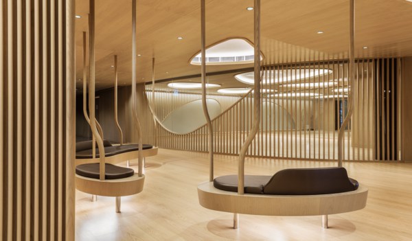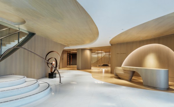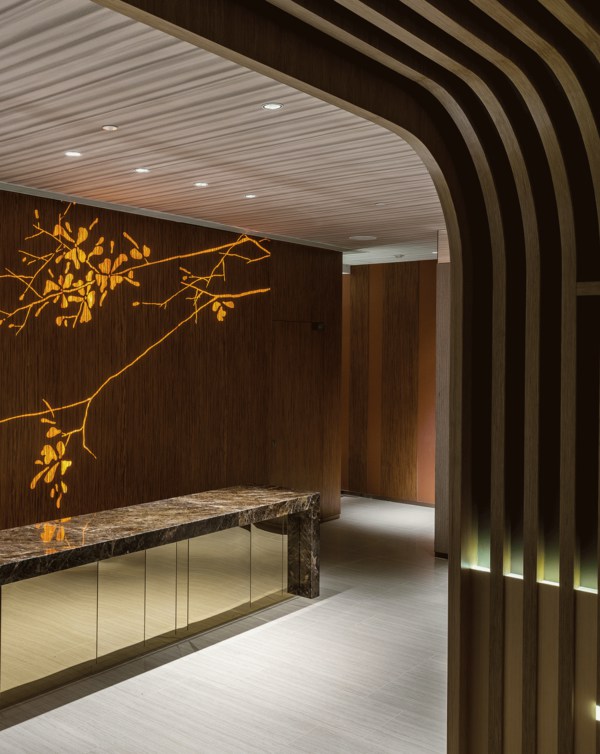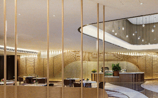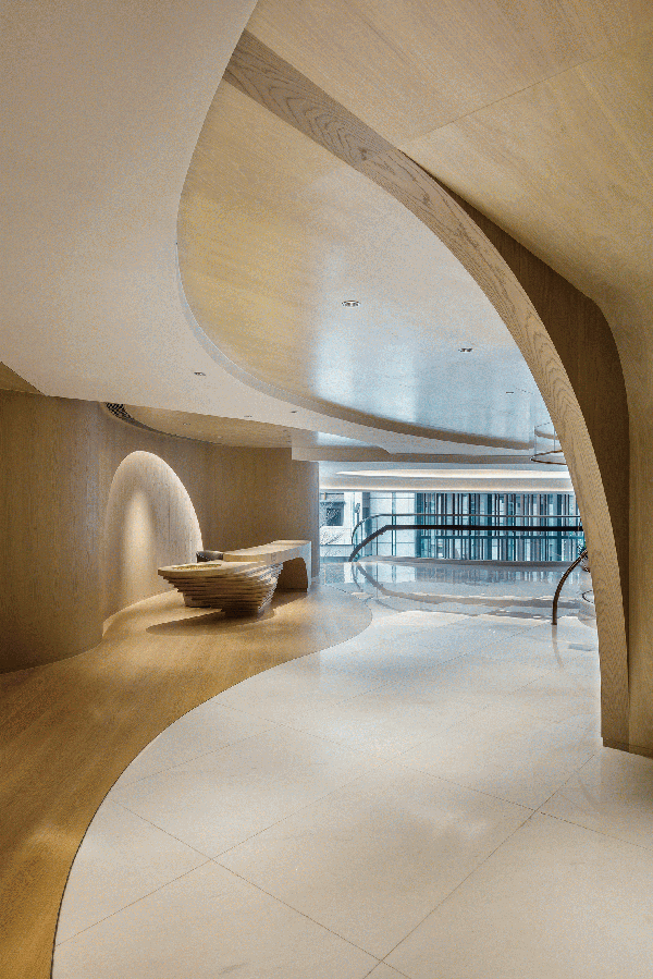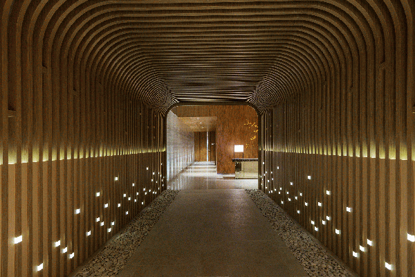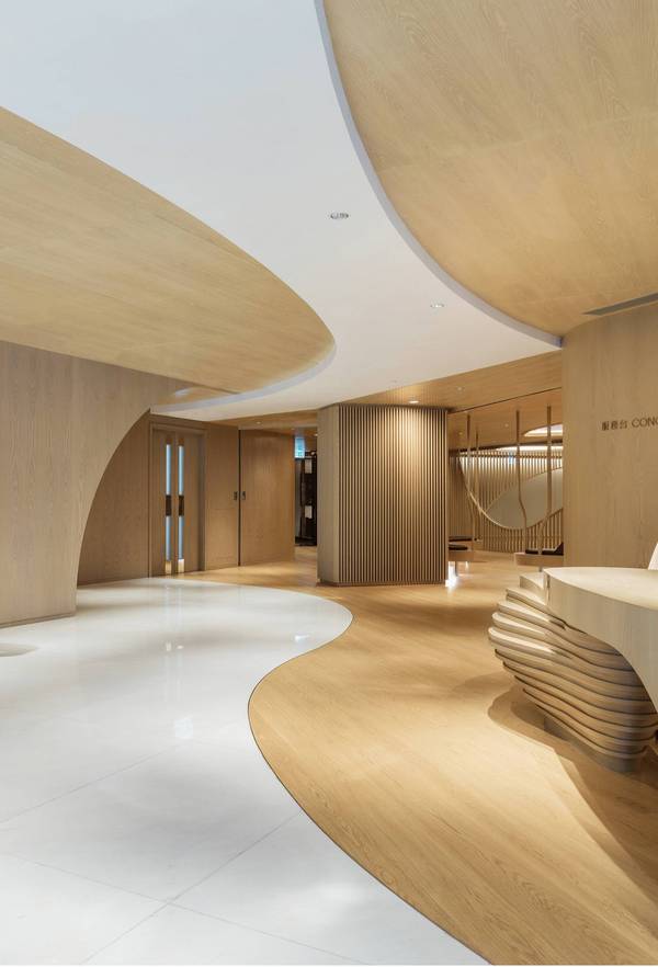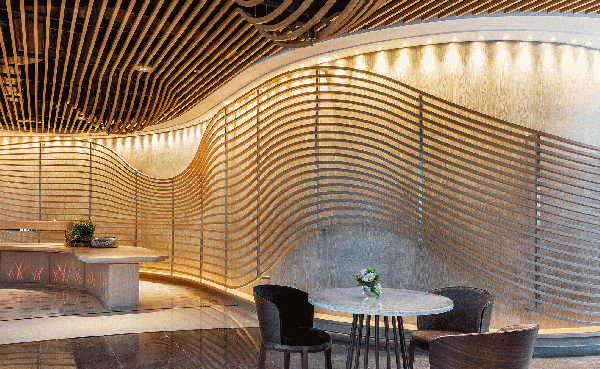 會(huì)所內(nèi)的木材不僅僅是結(jié)構(gòu)性的支持,起伏有致的輪廓?jiǎng)澐殖霾煌瑓^(qū)域,優(yōu)雅的弧線跨越寬敞的空間與柔和的燈光產(chǎn)生巧妙的相互作用。豐富的線條增強(qiáng)空間的立體感而不失悠閑的舒適享受,精妙的雕塑元素糅合簡(jiǎn)約的燈光折射及滲光燈槽,整體干凈利落,構(gòu)筑出精美雅意而富藝術(shù)感的視覺效果,凸顯設(shè)計(jì)師細(xì)膩的設(shè)計(jì)考量。