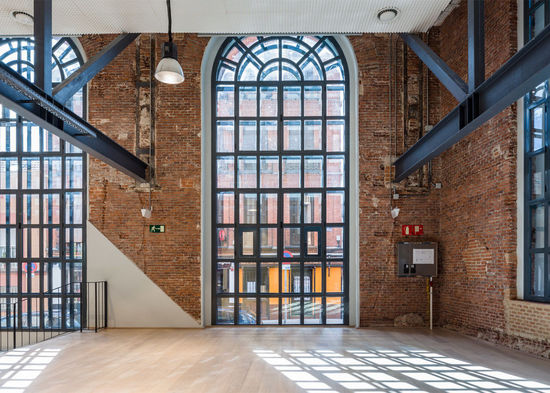 Jump Studios 需要改造的是位于馬德里的一所 19 世紀的電池工廠,有五層樓高,一些地方還保留了老式的紅磚墻。他們在對整個樓進行完全檢查后對區(qū)域做出了重新的布局,在北邊開辟了一個新的入口,用了有現(xiàn)代感的黑色金屬且貫通兩層。